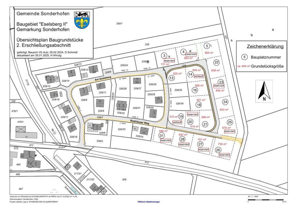 Anbei finden Sie eine Übersicht zum gesamten Baugebiet „Am Eselsberg“ und den noch freien Bauplätzen.
